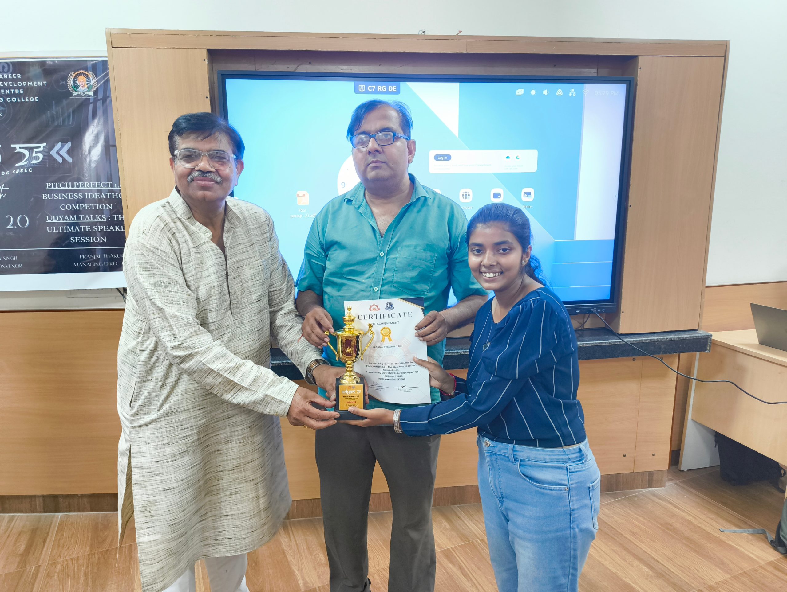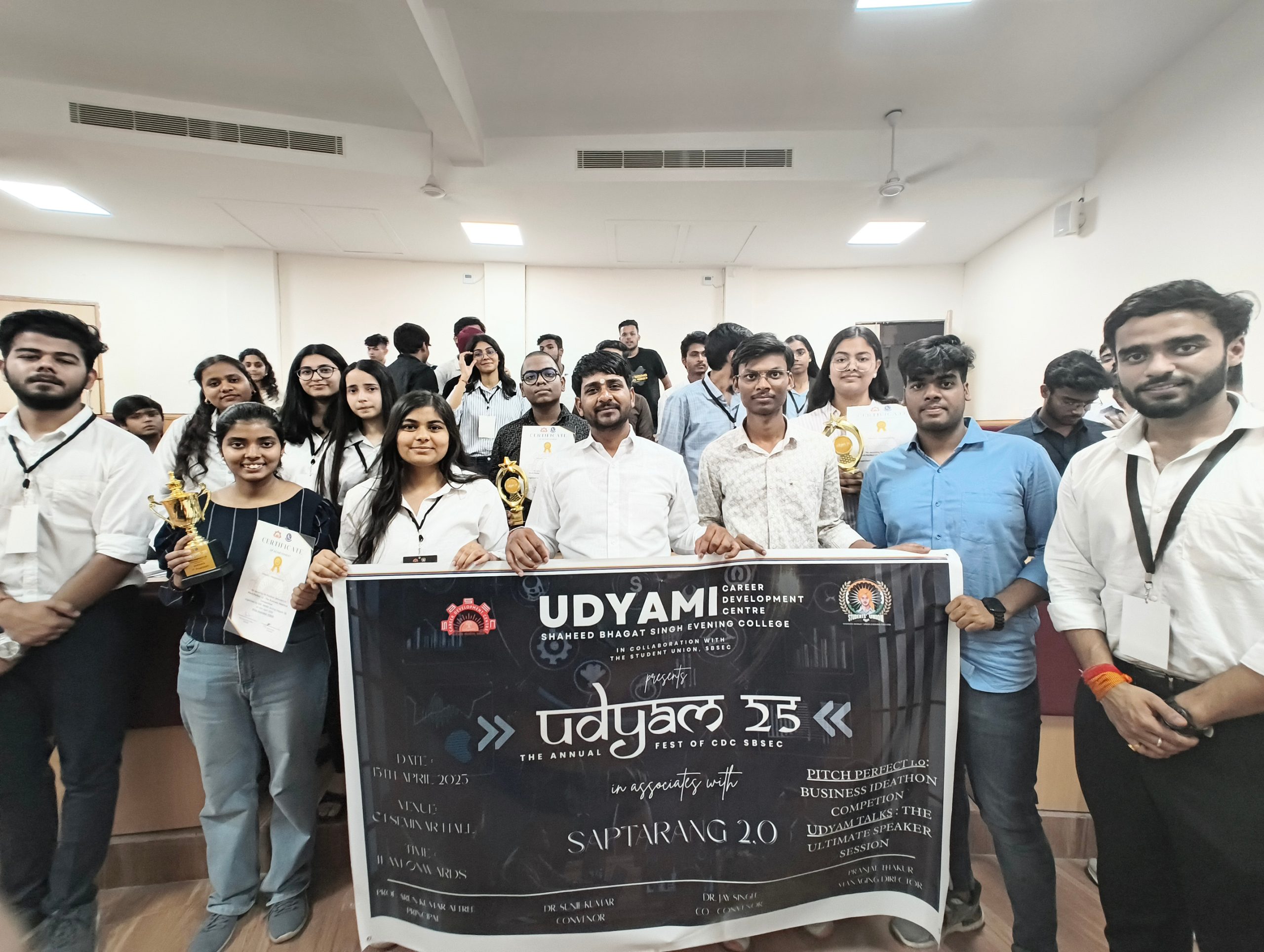 Within the Career Development Centre (CDC) at Shaheed Bhagat Singh Evening College, innovation continues to thrive. Under the mentorship of Shri Bharat Bhushan Ji and Dr. Abhishek Tandon, two students — Arpit and Aarav — achieved a remarkable milestone by securing a position among the Top 25 startups in the Delhi University Udhmodya Foundation’s Startup Accelerator Program.